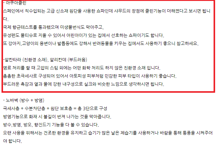 * 참고로 알칸타라는 이탈리아, 엑센느는 일본, 샤무드 알파는 한국, 아쿠아텍스 영국, 아쿠아클린 스페인, 조야 원단은 폴란드입니다.