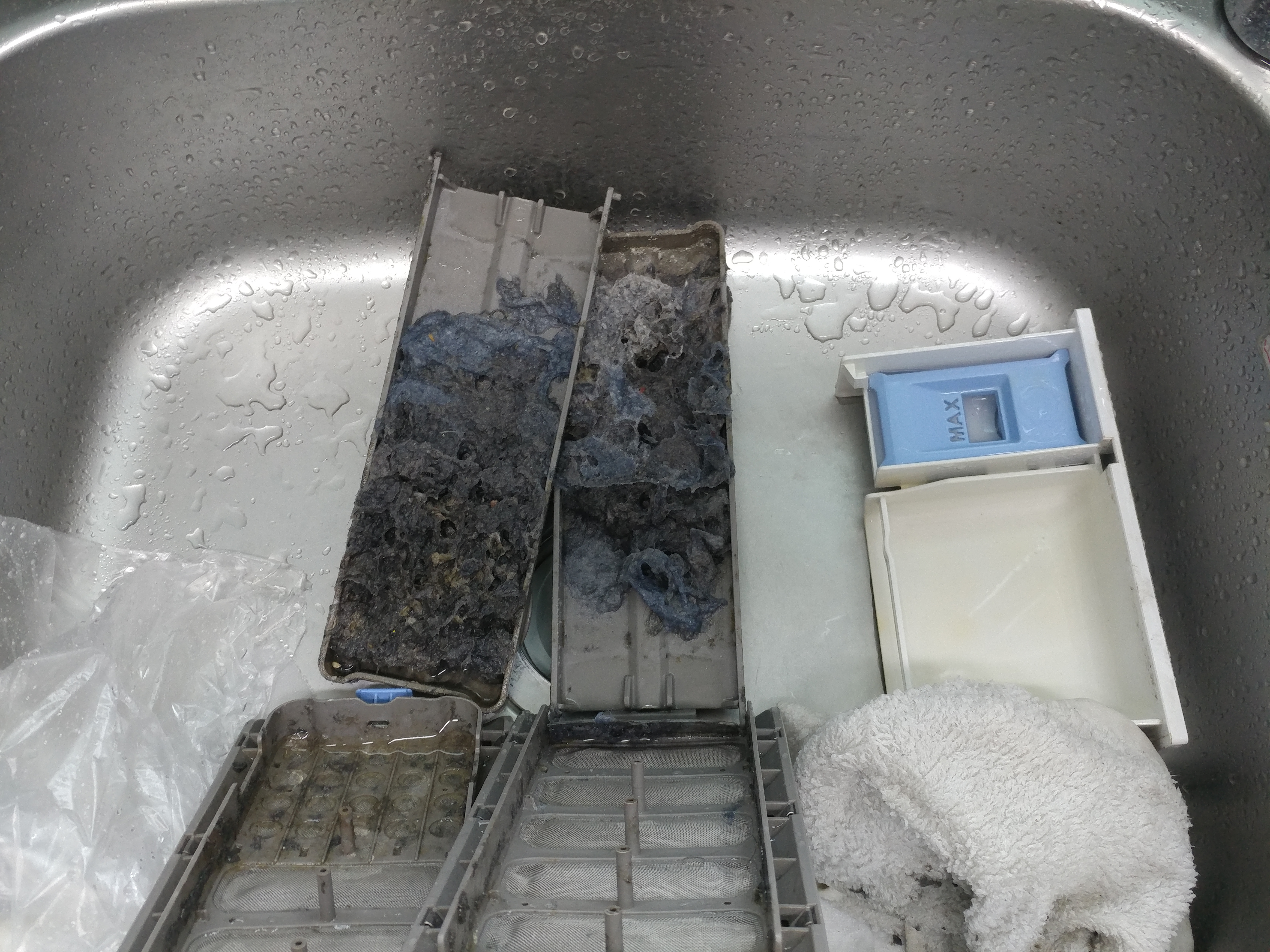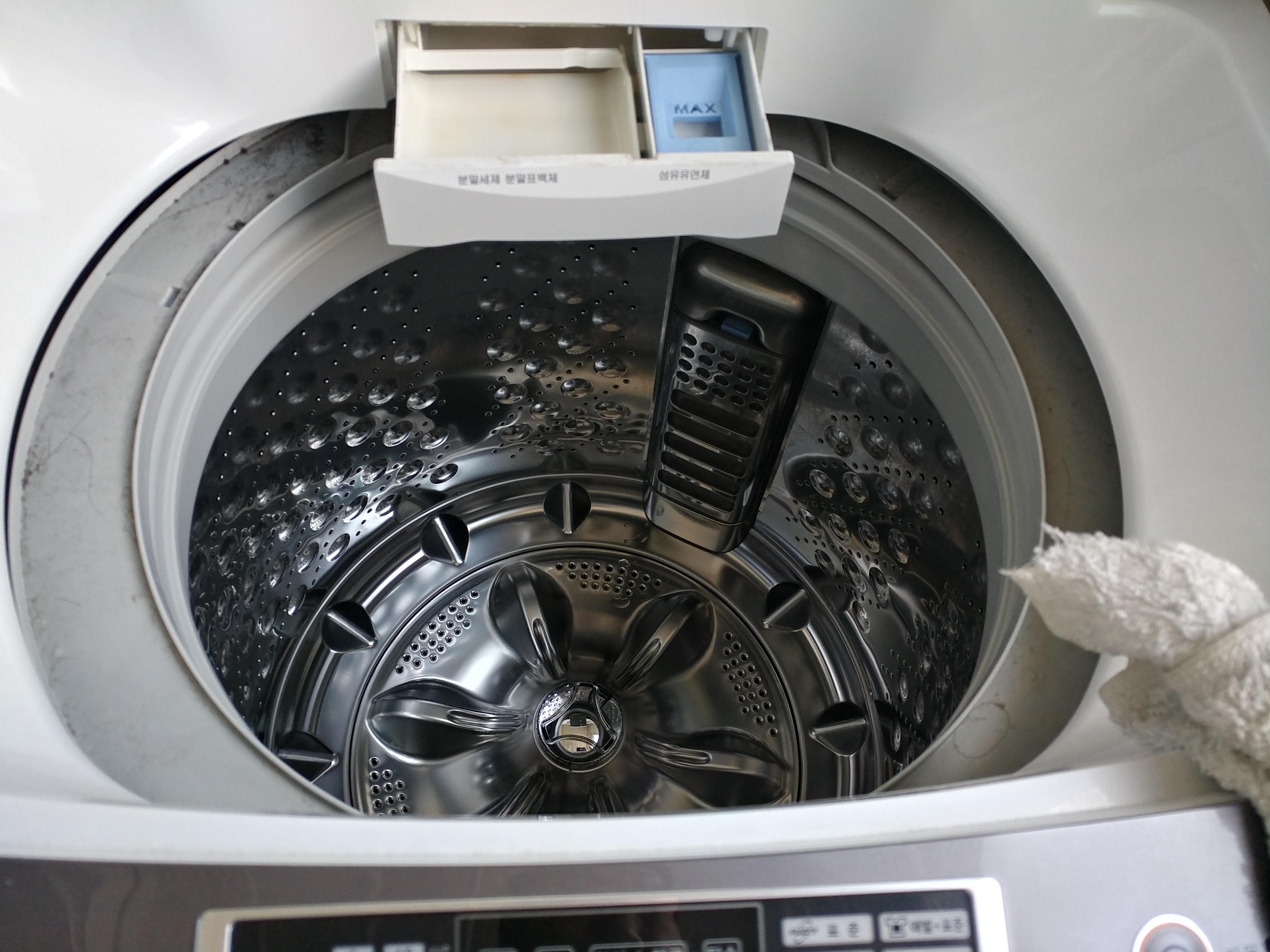 사실 사진에는 없지만 물을 받아서 과탄산소다가 녹을때까지 불린 뒤에 통을 돌려가면서 세척을 합니다. 물을 빼고, 다시 받고를 어느 정도 한 뒤에도 이물질이 둥둥 떠 다니더군요. 나중에 통세척이 끝나고 난 뒤에 세탁기 바닥을 보니 먼지가 조금 남아있어서 헹궁 모드로 2번 정도 통을 더 돌려줬습니다.