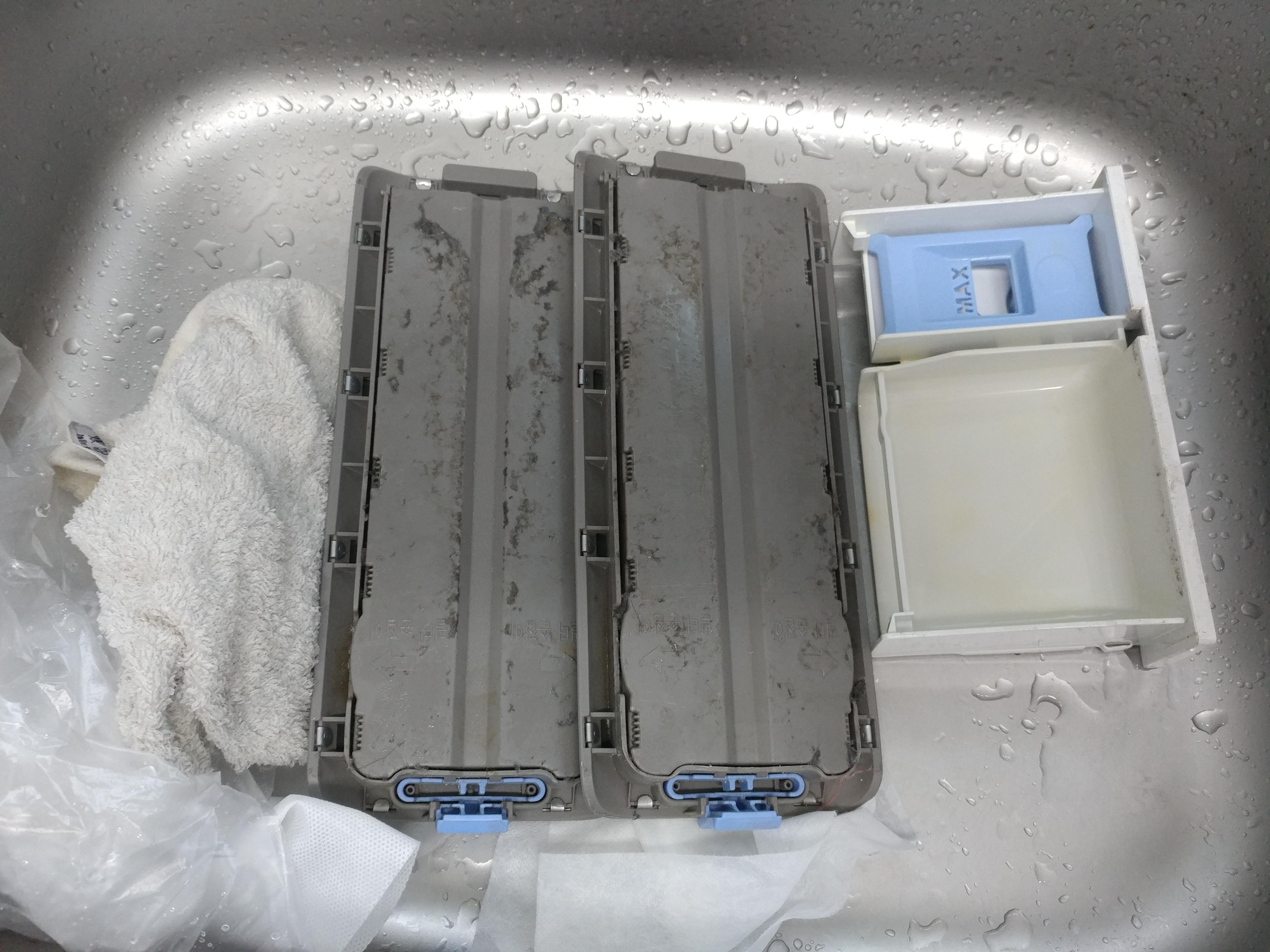 ▲ 본격적으로 청소를 하기 전에 깨끗한 걸레로 눈에 보이는 통 외부를 닦아줬습니다. 청소를 거의 하지 않아서 매우 더려운 모습인데요. 손으로 통을 이리저리 끌어당기면서 닦으니 깨끗하게 먼지와 머리카락 등을 닦아낼 수 있었습니다.