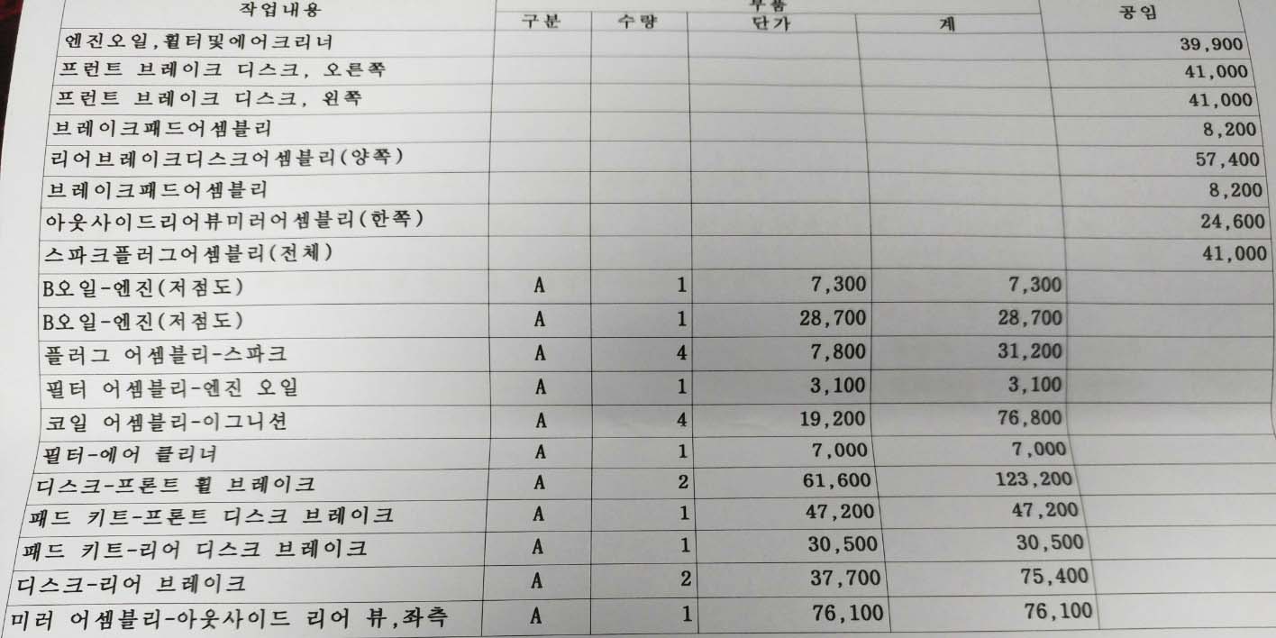 * 벨트 세트, 미션오일은 10만km가 넘어서 교환할때가 된거지 아직 문제는 아니라서 다음 정비때 하기로 했네요. 급한건 브레이크 디스크라서 이 부분은 절대 미루면 안된다고 했습니다.