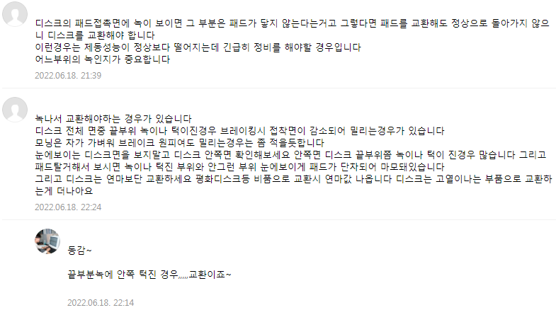 참고로 브레이크 디스크의 경우 녹 발생은 자연스러운 일이고, 주행하면서 브레이크를 밟으면 자연스럽게 사라지기 때문에 녹이 폈다는 것만으로 교환을 할 필요는 없다고 합니다. 그래서 좀 찾아보니 다음과 같은 덧글을 봤습니다.